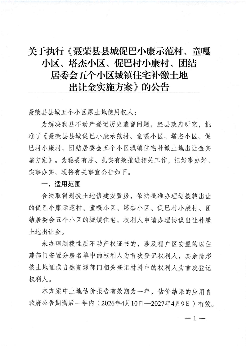 关于执行《聂荣县县城促巴小康示范村、童嘎小区、塔杰小区、促巴村小康村、团结居委会五个小区城镇住宅补缴土地出让金实施方案》的公告